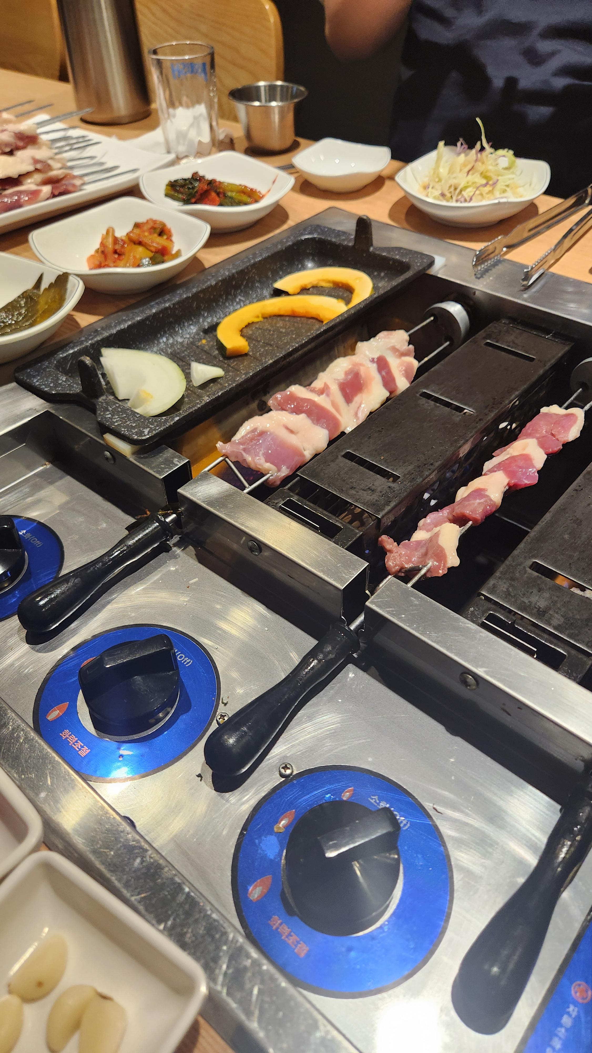철판 밑에 가스불이 4곳에서 나와서 꼬치를 골고루 구워줍니다.