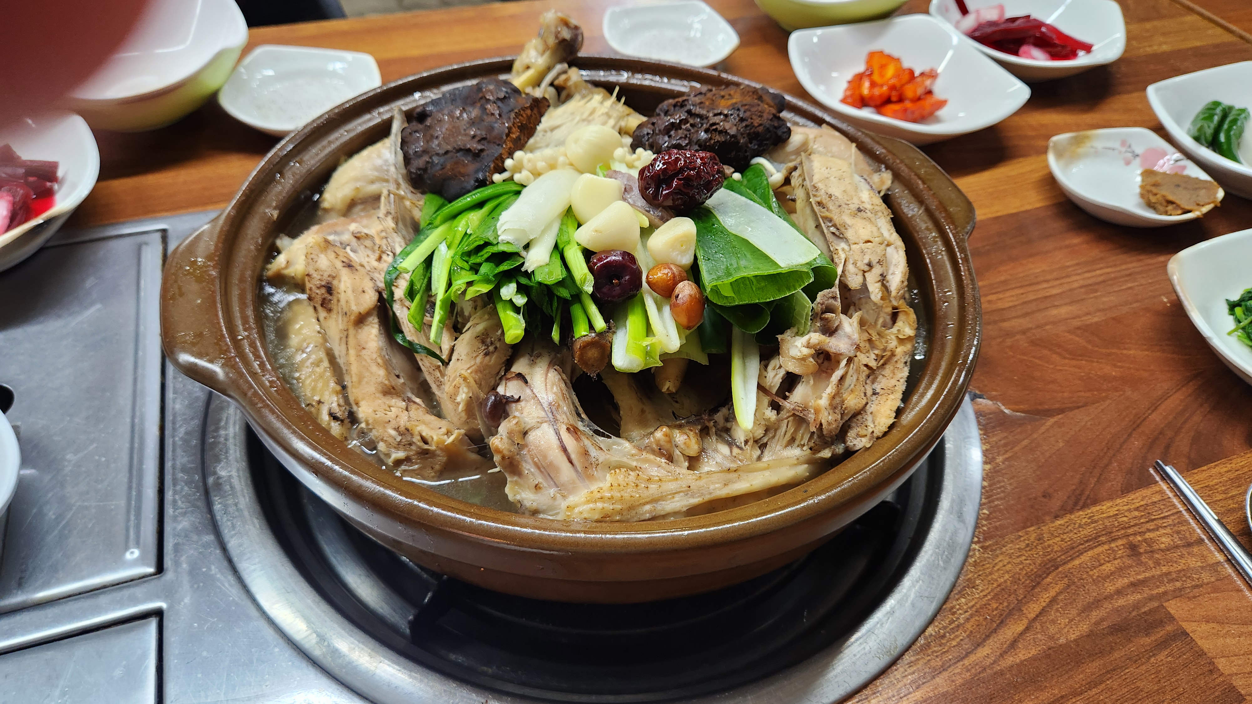 차를 타고만 가야하는 외진곳에 있는데, 백숙 국물이 정말 좋았습니다. 버섯하고 한약으로 달였다고 하는데, 국물을 더 달라고하시면 더 주십니다. 그걸 몰라서 다들 조심해서 국물을 마시고 있었네요.